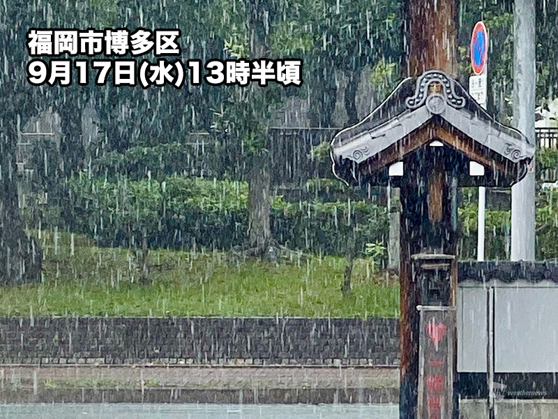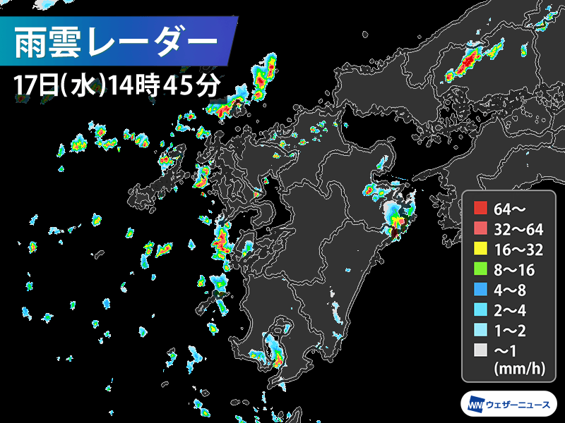 午後になって宮崎県内ではアメダスえびの高原が1時間に17.0mm、アメダス北方が15mmのやや強い雨を観測しました。福岡市市街地からも雨の報告が寄せられています。