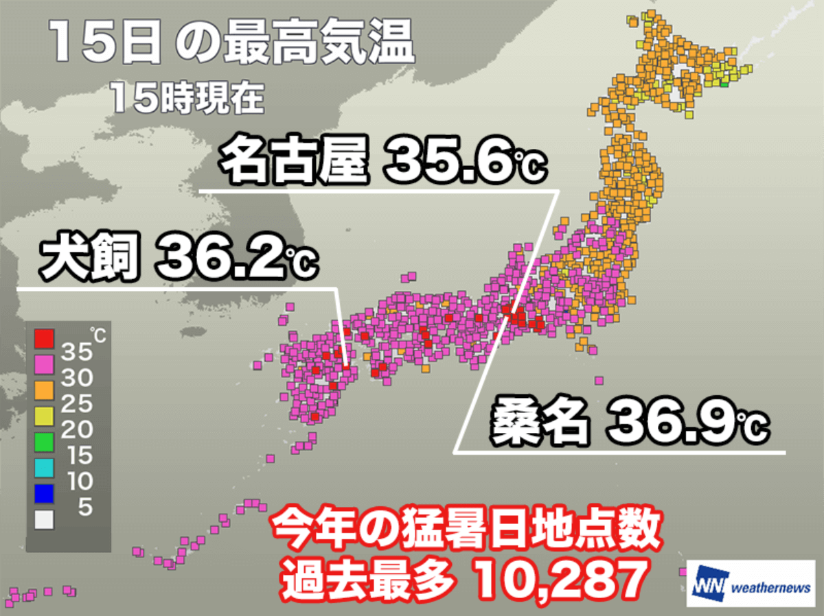 三連休最終日の15日(月)は、東海から西日本の各地で厳しい残暑となりました。