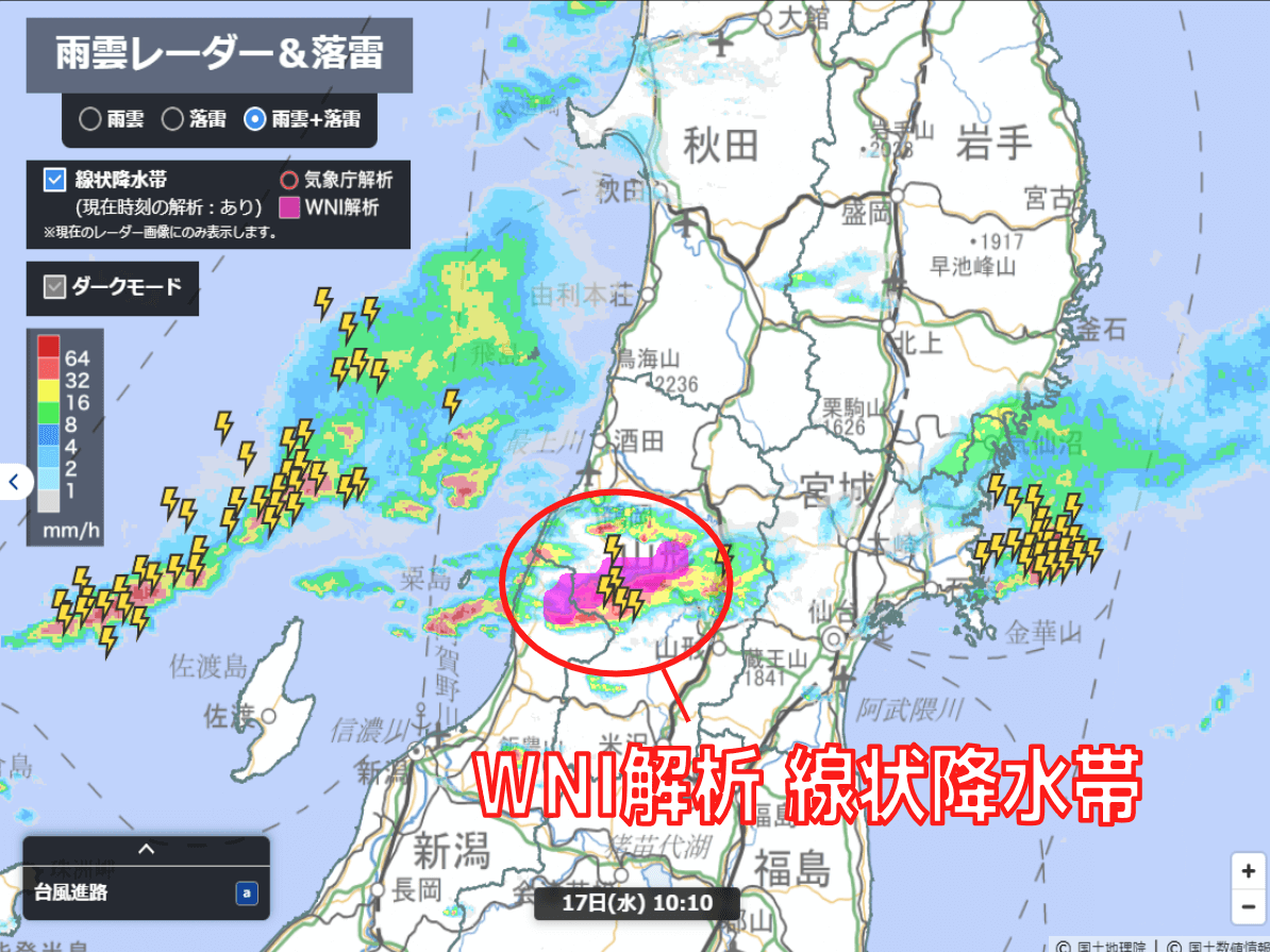 17日(水)、前線通過に伴い、発達した雨雲が流れ込んだ東北では、日本海側を中心に激しい雷雨や大雨となりました。