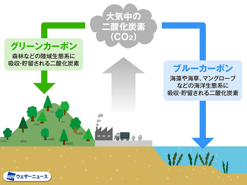 一方、グリーンカーボンは草や木などの陸の植物が二酸化炭素を吸収することです。「グリーン」は森林や草原などの陸上の植物の緑色にちなんでいます。
