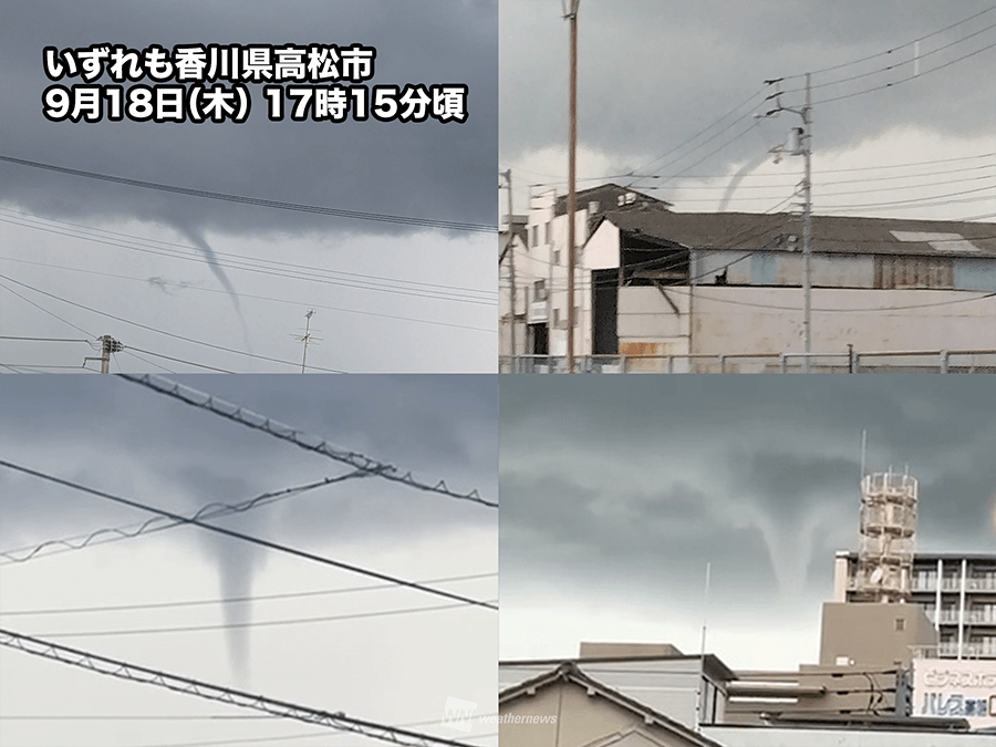 高松市付近のウェザーニュースアプリ利用者からは、17時15分すぎから雲の底から垂れ下がるような「ろうと雲」とみられるウェザーリポートが相次いで寄せられました。