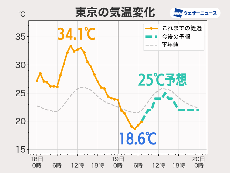 関東では昼間も日差しが乏しく涼しい東風が吹くため、気温の上昇は昨日までと比べて大幅に抑えられる見込みです。東京の予想最高気温は25℃で、昨日の最高気温から9℃低い予想となっています。