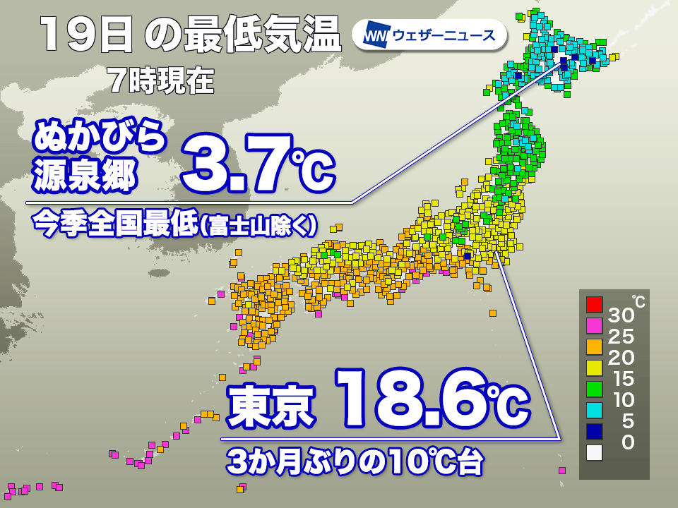 東京都心で3か月ぶりに20℃を下回る 北海道では最低気温3.7℃を観測