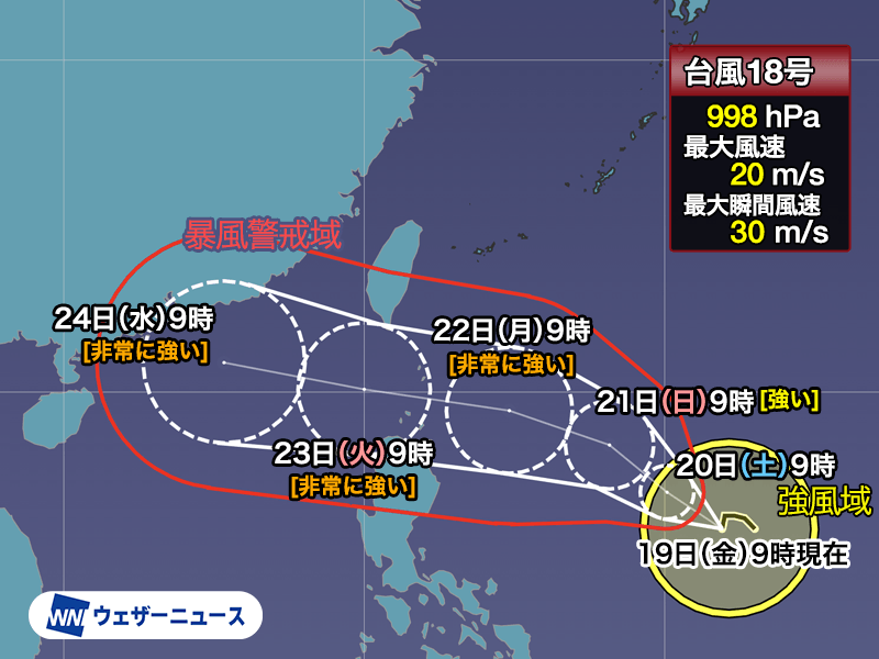 台風18号はこのまま西寄りに進む予想で、明日20日(土)は暴風域を伴う予想です。その後は急速に発達し、21日(日)には強い勢力、22日(月)には非常に強い勢力になるとみられます。