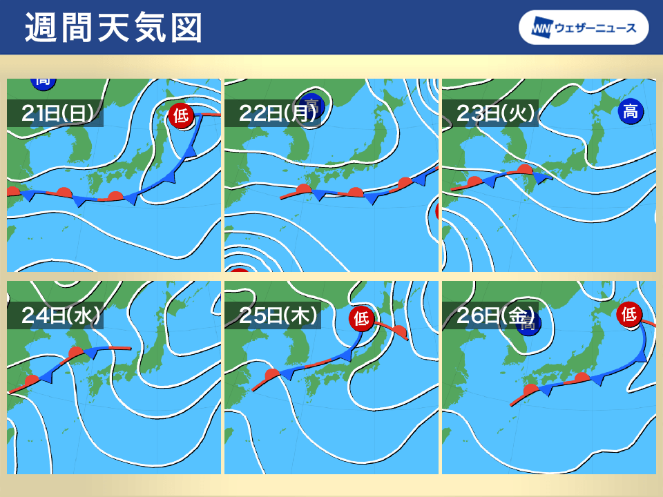 22日(月)〜24日(水)は秋雨前線の活動は弱まる見込みですが、25日(木)頃は再び低気圧や前線の影響を受ける所が多くなる予想です。