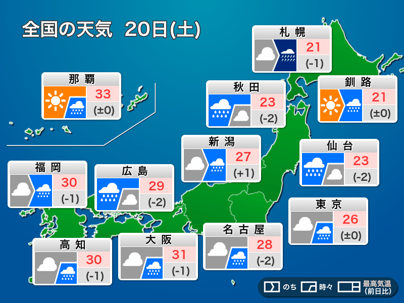 活発な雨雲が通過するタイミングでは落雷や突風などを伴う可能性もあります。暖かく湿った空気が流れ込むため、雨が降り出すまでは少し蒸し暑く感じそうです。