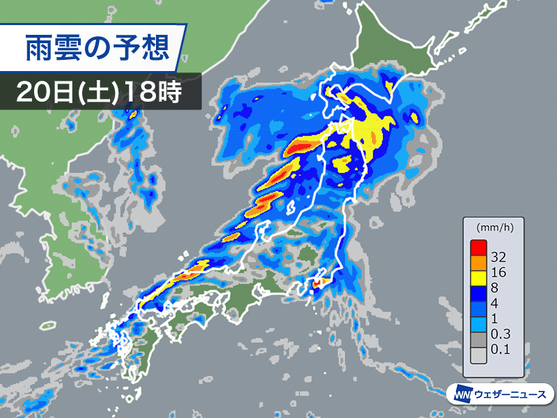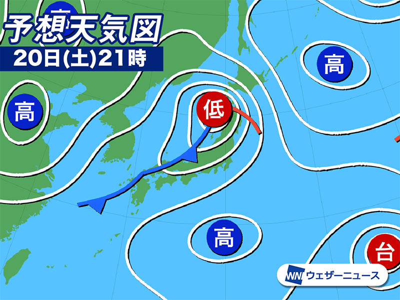 今夜にかけては低気圧が北日本に近づき、寒冷前線が日本海を南下します。九州から東北の広い範囲で雨が降りやすくなるため、土曜日のお出かけは傘を忘れずにお持ちください。