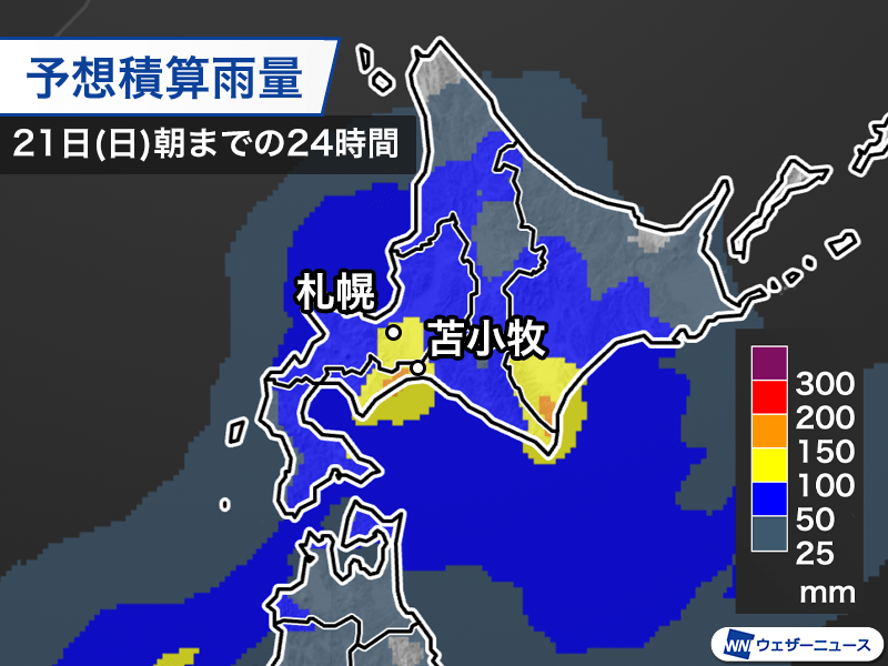 低気圧が通過する北海道は今夜から明日21日(日)にかけて断続的に強雨となり、総雨量が多くなる予想です。