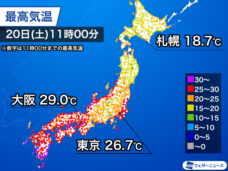 今日20日(土)11時までの最高気温は、仙台21.8℃、秋田20.0℃、札幌18.7℃となっています。