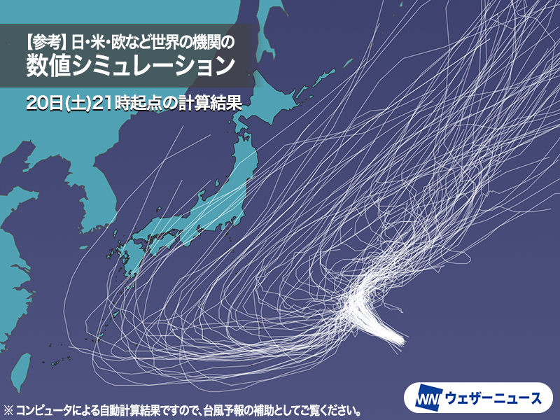 これらを比較すると、しばらく北西に進む所までは揃っていて、その後はコースにばらつきがあることがわかります。現時点では動きが遅くなった後に北寄りに進路を変えるものが多数ですが、西寄りに計算するものも少なくありません。不確実性が大きいと言えます。