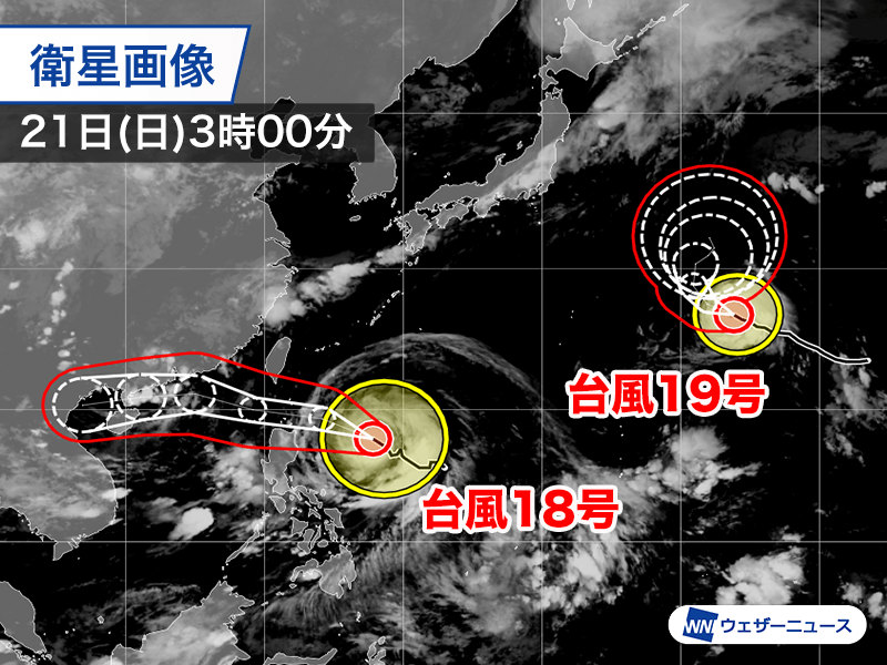 現在、日本の周辺には台風18号(ラガサ)、台風19号(ノグリー)が発生しています。