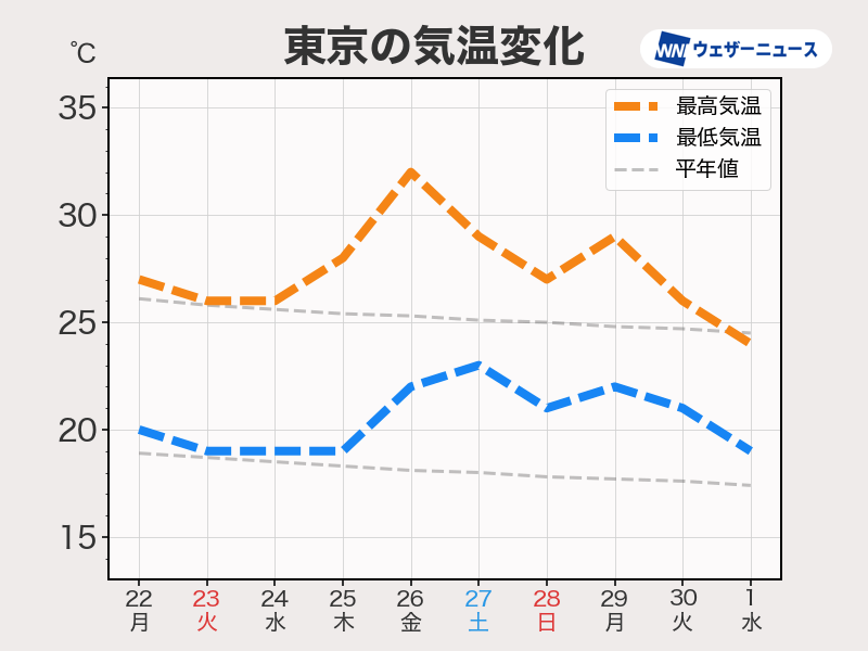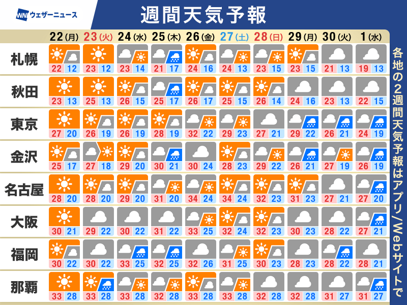 一方、最低気温は25℃を下回る日が多く、朝晩は涼しさを感じることもありそうです。服装で体感温度を調整し、体調管理を心がけてください。
