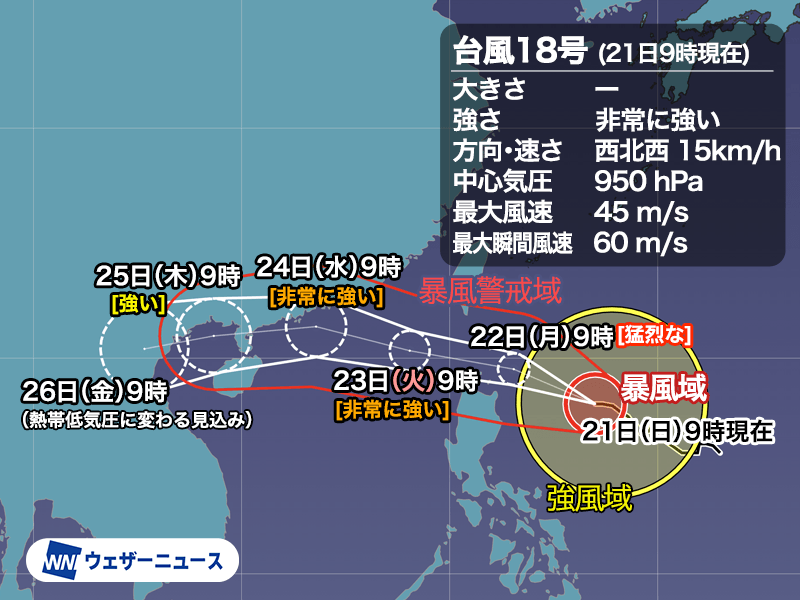 21日(日)9時現在、強い勢力の台風18号はフィリピンの東を西北西に進んでいます。さらに勢力を強めながら西進を続け、明日22日(月)には猛烈な勢力まで発達する予想です。