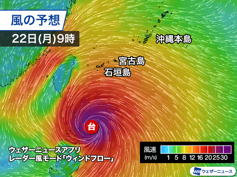 特に先島諸島では平均で15m/s前後、瞬間的には20m/s前後の強風が吹く予想です。波は5m以上のシケとなるため、台風の接近時は海のレジャーを控えるようにしてください。