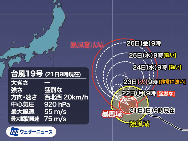 猛烈な勢力の台風19号は明日22日(月)にかけて北西に進んだ後、動きが非常に遅くなる見込みです。