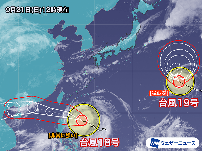 現在、日本の周辺には台風18号(ラガサ)、台風19号(ノグリー)が発生しています。