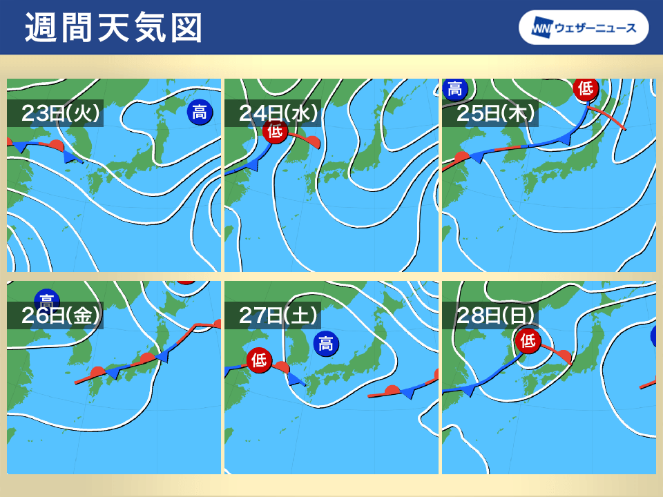 この先、日本付近には高気圧と低気圧が交互に接近、通過します。