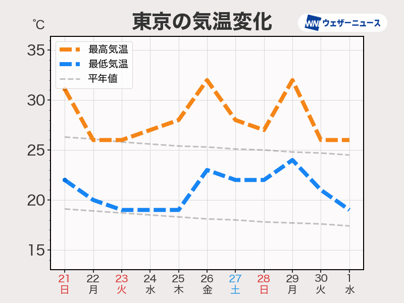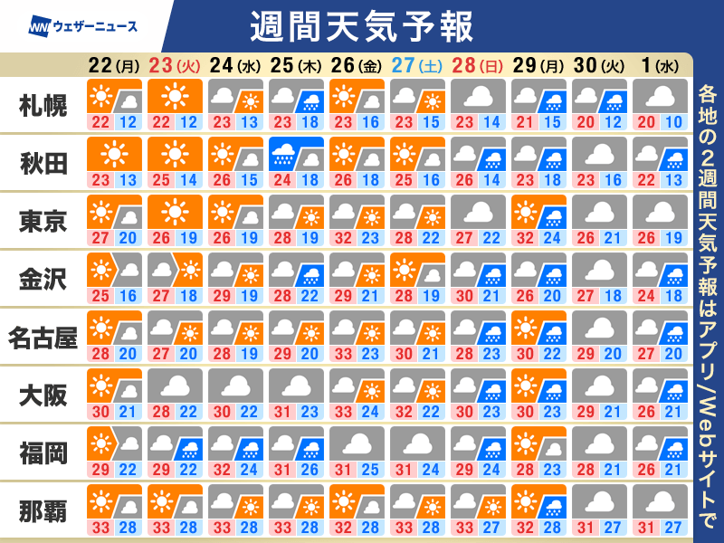 一方、最低気温は25℃を下回る日が多く、朝晩は涼しさを感じることもありそうです。