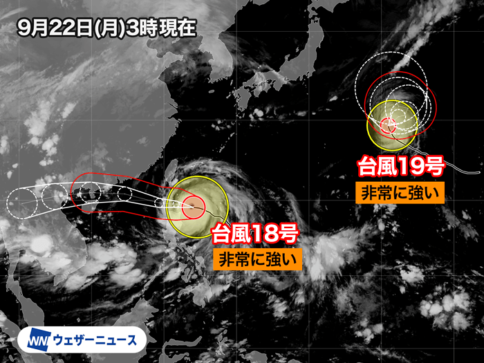 現在、日本の周辺には台風18号(ラガサ)、台風19号(ノグリー)が発生しています。