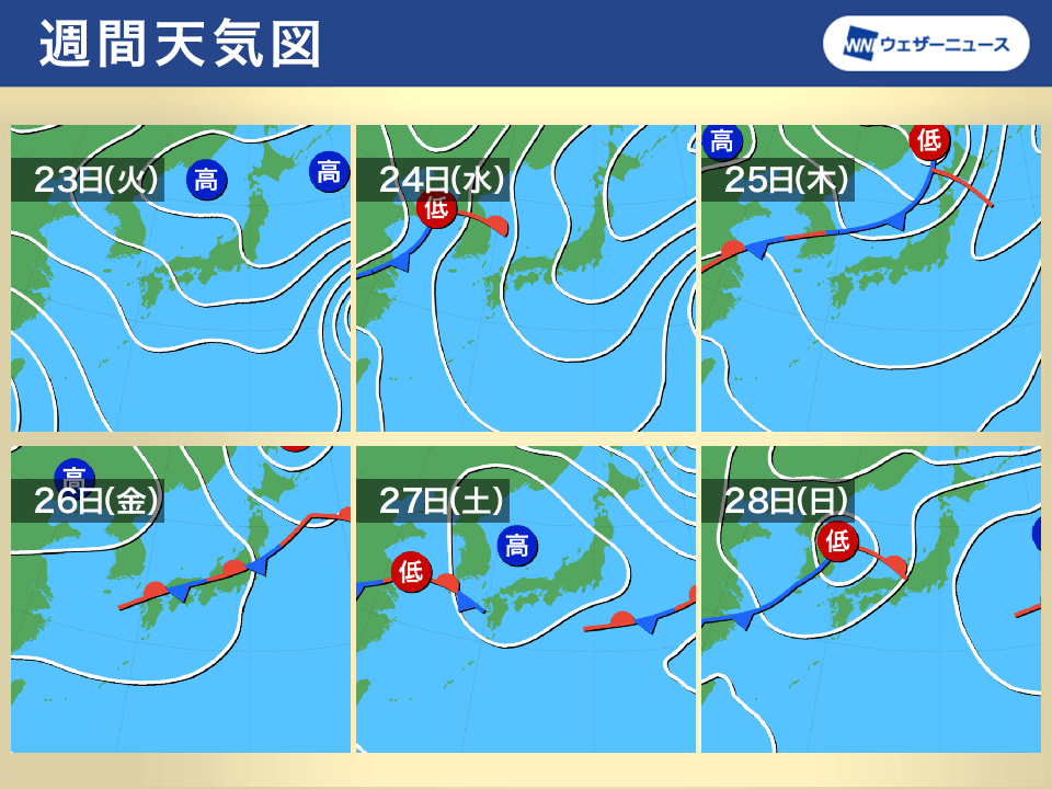 週間天気予報 体感変化の大きい一週間 周期的に低気圧通過で雨