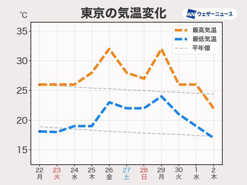 一方、最低気温は25℃を下回る日が多く、朝晩は涼しさを感じることもありそうです。日ごとや朝晩と昼間の寒暖差が大きくなるため、服装で体感温度を上手に調整し、体調管理を心がけてください。