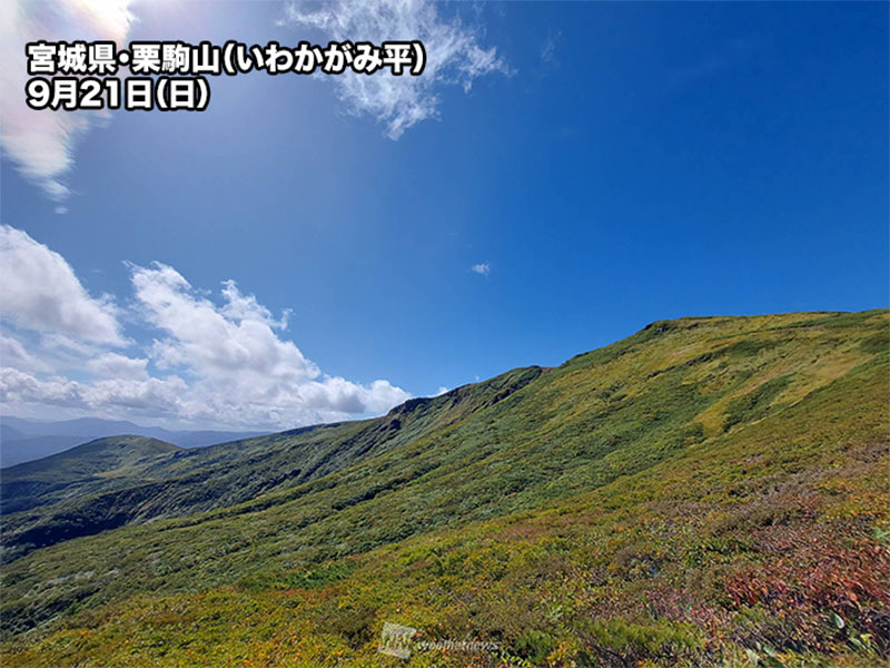 北海道や標高の高い地域では、朝晩の冷え込みが強まるにつれて色づきが順調に進むとみられます。大雪山系では9月下旬にかけて、室堂平では9月下旬〜10月上旬に見頃を迎える予想です。