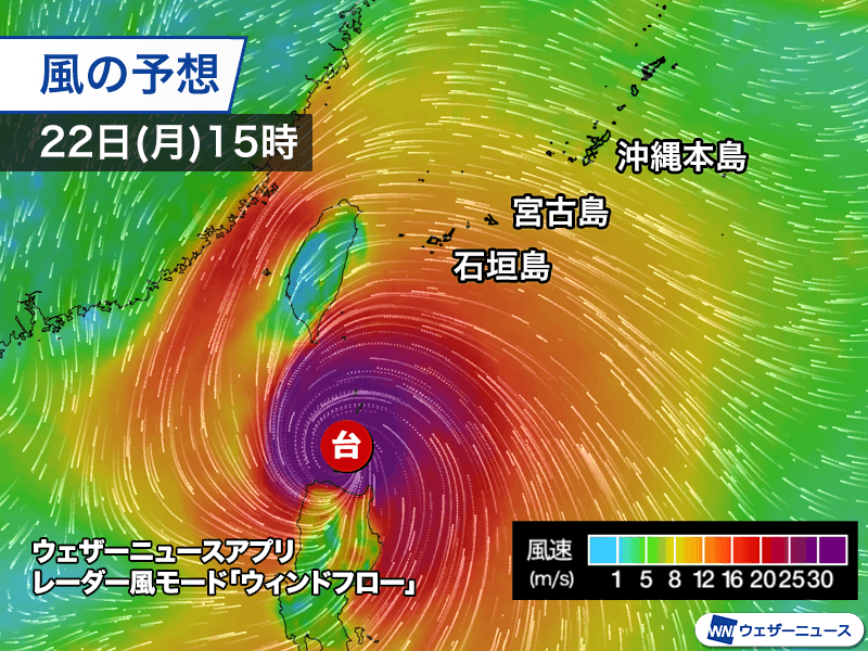 進路に近いフィリピン・ルソン島や台湾では23日(火)にかけて荒天が予想され、その後は中国・華南を中心に風雨が強まる見通しです。渡航の予定がある場合は最新の台風情報をご確認ください。