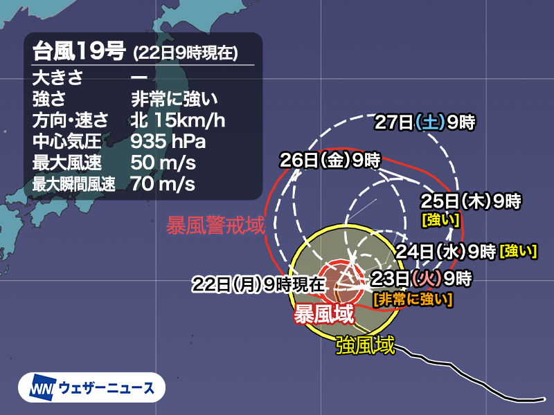 24日(水)には非常に強い勢力で中国・華南にかなり近づくとみられます。その後は急速に勢力が衰え、26日(金)にはラオスで熱帯低気圧に変わる予想です。