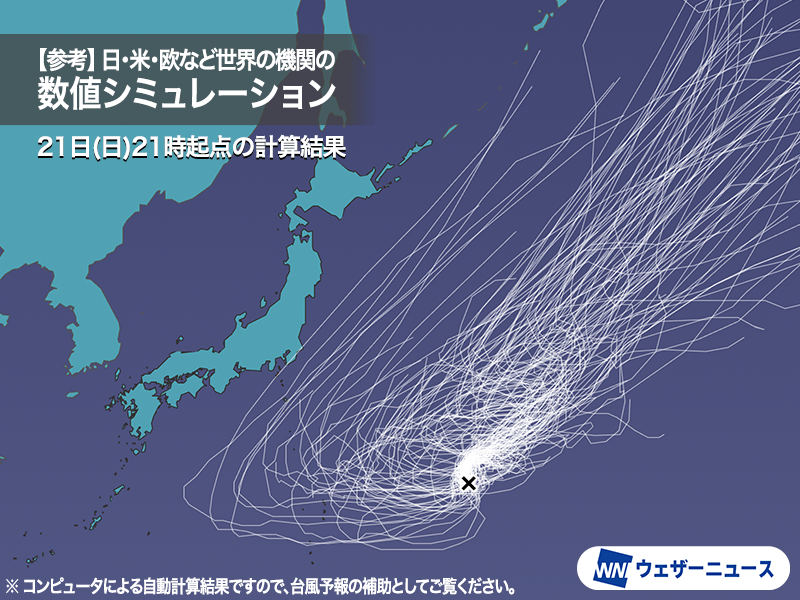 これらを比較すると、やや北上するところまでは揃っていますが、その後はコースにばらつきがあることがわかります。現時点では動きが遅くなった後に北から北東方面に進路を変えるものが多数となっていて、西寄りに計算するものは前日の予想よりは少なくなってきています。まだ予測の不確実性が大きい状況ではありますので、今後の予測に変化が発生する可能性もあります。