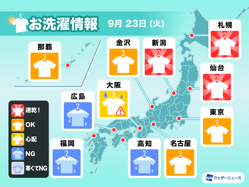 北日本や東日本は移動性高気圧の圏内で秋晴れとなります。道北や本州内陸のごく一部では雨の心配はありますが、ほとんどのところで洗濯日和となります。空気も比較的乾燥しているので、乾くまでの時間も短そうです。