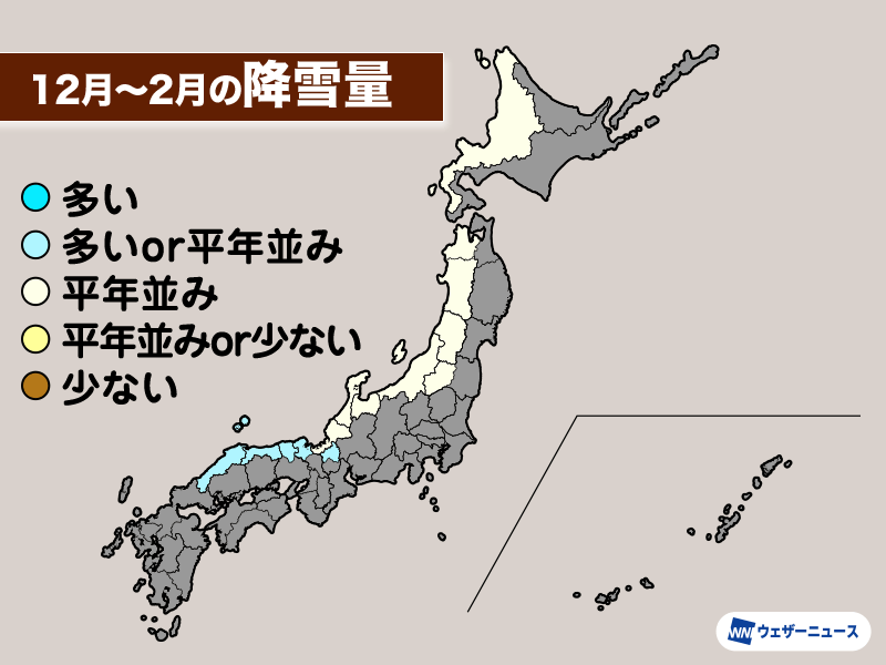 冬型の気圧配置になりやすいため、日本海側で降水量が多く、太平洋側で少ない傾向が顕著になるとみられます。