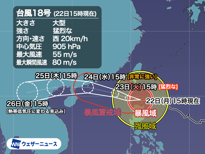 22日(月)15時現在、台風18号は強風域が半径500kmに拡大し、大型で猛烈な勢力になっています。明日23日(火)にかけて猛烈な勢力を保ったまま南シナ海に進む見込みです。