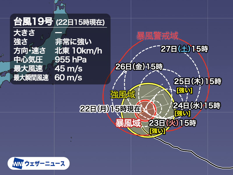 台風19号は発達のピークを過ぎ、猛烈な勢力から非常に強い勢力に変わっています。上空を吹く強い西寄りの風、偏西風にはまだ乗ることができず、東西を高気圧に挟まれる形になるため進路が定まりません。