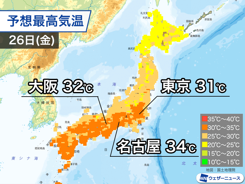 26日(金)の最高気温分布をみると西日本から関東に30℃以上のエリアが広がり、東北でも一部で30℃を超える予想となっています。