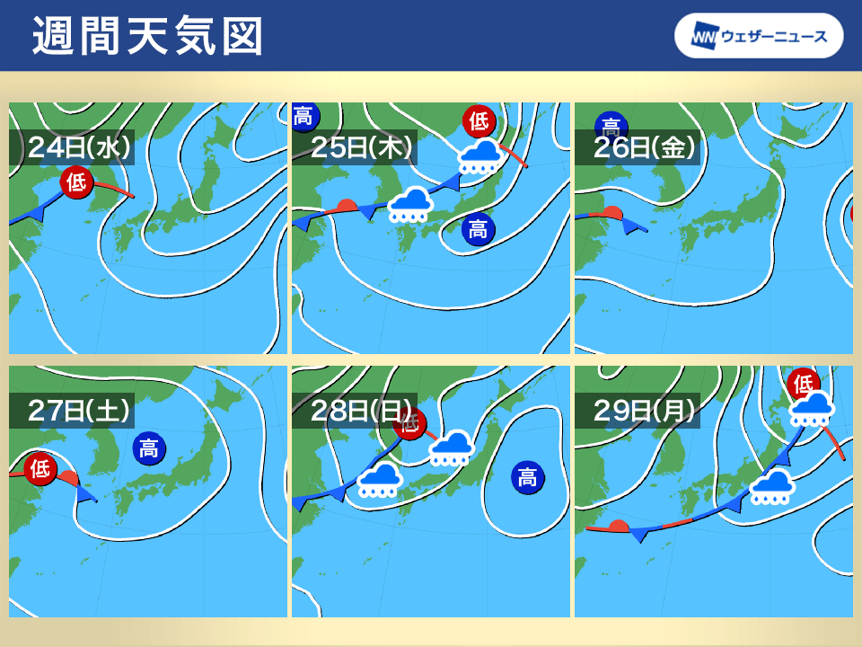 前線が北上して暖かな空気が流れ込んだ後に天気が回復すると気温が上昇します。今週では25日(木)の前線北上後の26日(金)に最も気温が上がりやすくなる見通しです。