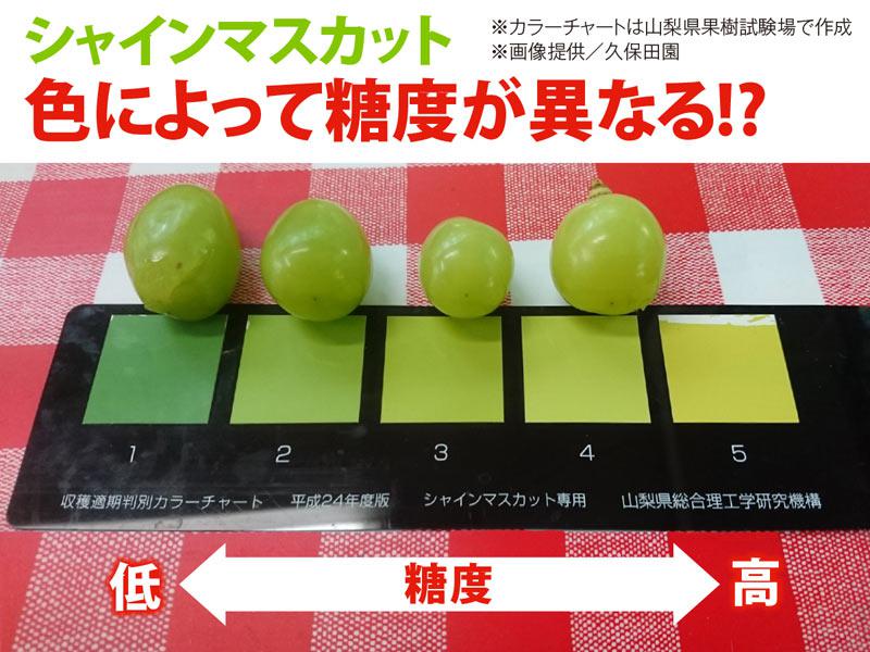 ただし、シャインマスカットはまれに生育過程で陽に当りすぎると糖度とはあまり関係なく黄色くなるものもあります。私はお客さんには、たいていは色味で判断できるけれど、それはあくまでも目安であって、糖度を保証するものではないですよ、と説明しています」(久保田さん)