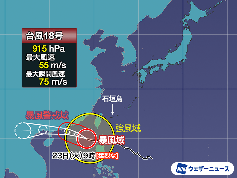 台風19号は発達のピークを過ぎ、猛烈な勢力から2階級下がって強い勢力に変わっています。