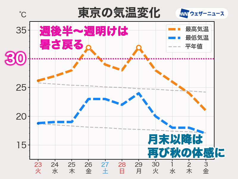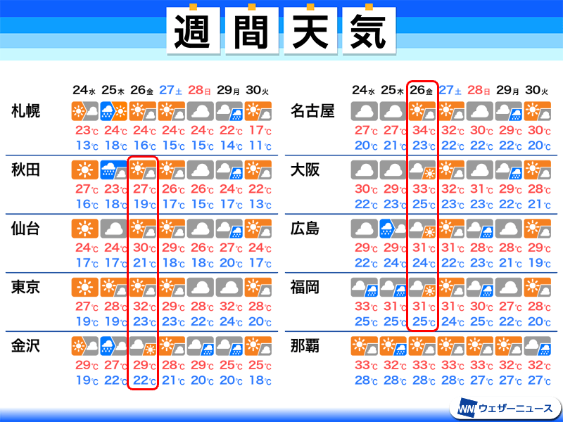 特に、26日(金)は全国的に気温が上がりやすくなる見込みです。予想最高気温は仙台で30℃、東京都心で32℃、大阪で33℃、名古屋では猛暑日一歩手前の34℃となっています。一旦涼しくなったところから再び汗ばむ暑さになるため、体調を崩さないようお気をつけください。