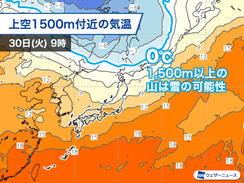 北海道の上空1500m付近には0℃以下の寒気が南下するため、標高1500m以上の山では雪が降る可能性もあります。