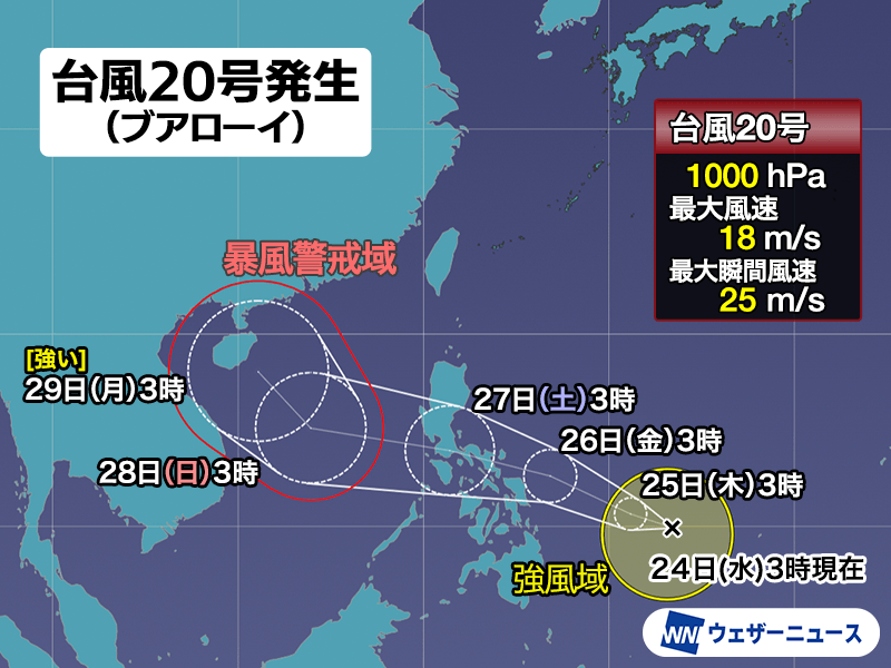 台風20号(ブアローイ)は日本の南から東シナ海に張り出す太平洋高気圧の南縁に沿って西寄りに進んでいます。進路の予想を見ると、25日(木)〜27日(土)頃にフィリピンを通過して南シナ海に向かい、その後は海南島やトンキン湾、ベトナム方面に進む可能性が高くなっています。