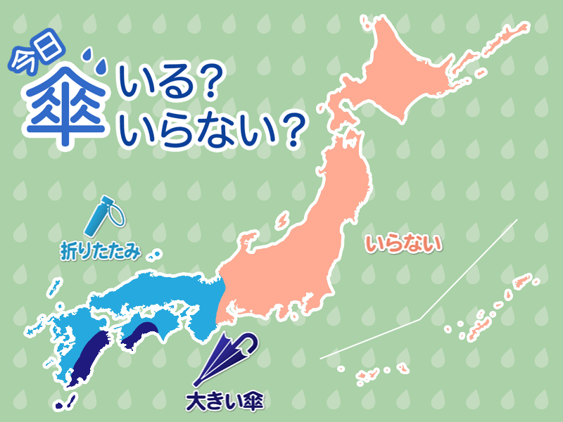 中国地方や四国の瀬戸内側、九州の日本海側や東シナ海側では、雨の降る可能性があります。