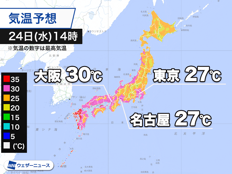 最高気温は大阪30℃、広島29℃、高知27℃、福岡32℃、鹿児島31℃の予想です。
