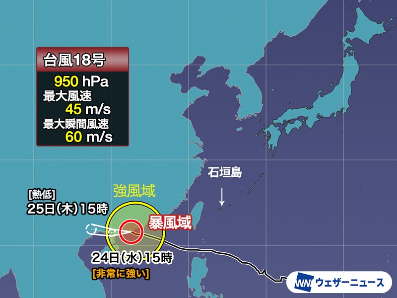 台風18号は西寄りに進んで沖縄からさらに離れつつあります。