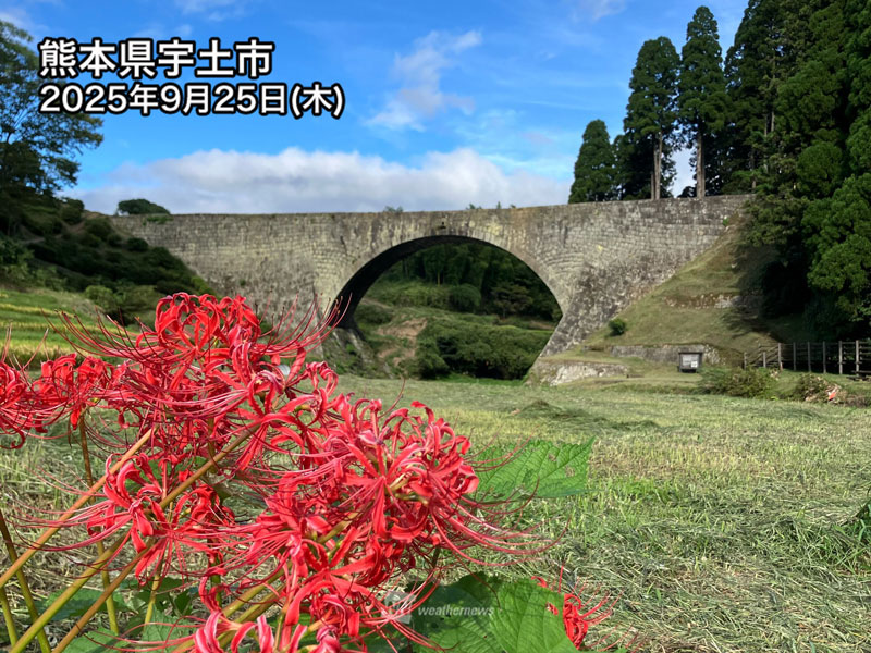 今週末は高気圧圏となる明後日27日(土)は広範囲で秋晴れ。秋空の下で映える彼岸花を楽しめそうです。大陸から前線が接近する28日(日)になると西から天気が下り坂となり、雨が降り出すところもあります。