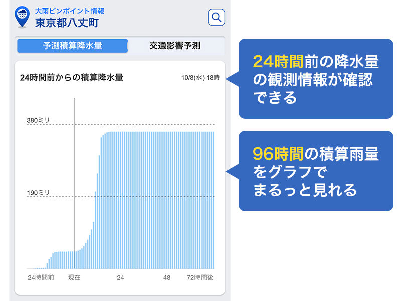 さらに、交通影響予測は予想積算雨量とタブで切り替えて確認できるようになりました。