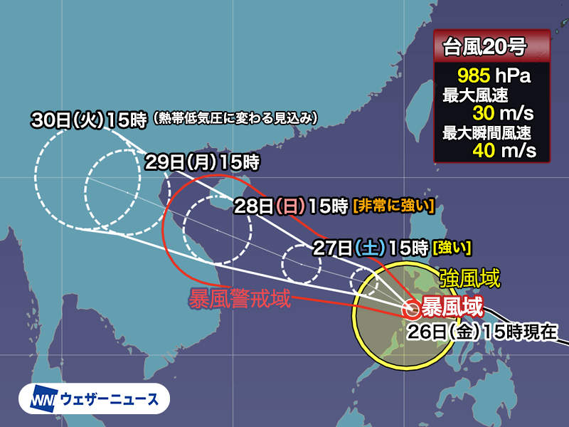 台風20号はフィリピンを通過して南シナ海に抜けました。海上に抜けたことで再発達する予想で、28日(日)には非常に強い勢力となって海南島の南を通過。その後は勢力を保ったままベトナムに上陸する見込みです。