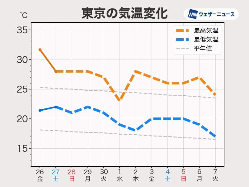 先週後半から秋らしい日が増えてきたものの、この先は平均すると平年のこの時期より気温は高めの予想です。天気に合わせて気温もアップダウンし、涼しい日と暑い日が繰り返される見通しです。
