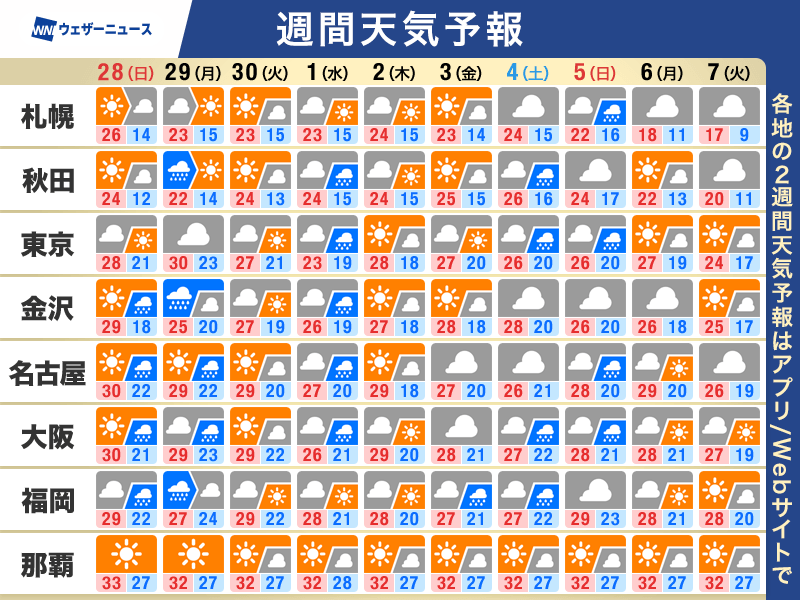 28日(日)は、朝鮮半島付近から日本海に進む低気圧の影響で西日本から天気が下り坂となり、午後は西日本で雨の降りだす所がある見込みです。