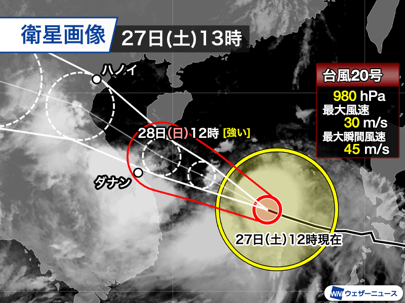 明日になると台風の周囲を取り巻く発達した雨雲がベトナムに広がり、中心が通過する明後日29日(月)の朝にかけて風雨のピークになるとみられます。