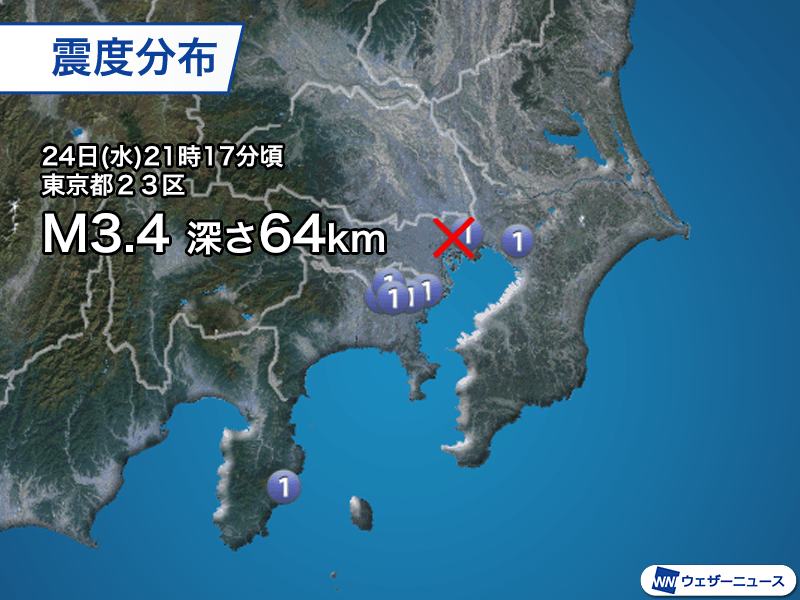 24日(水)21時17分頃、東京都23区を震源とするマグニチュード3.4、深さ64kmと推定される地震が発生しました。この地震で東京都江戸川区、神奈川県横浜市鶴見区、神奈川区、千葉県千葉市花見川区などで震度1を観測しています。